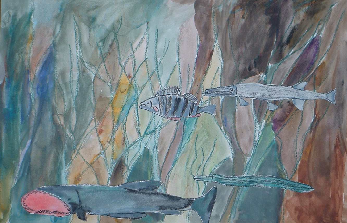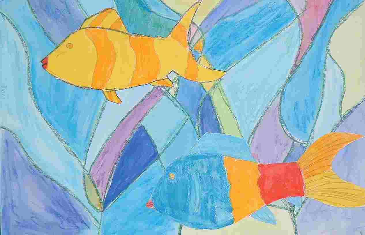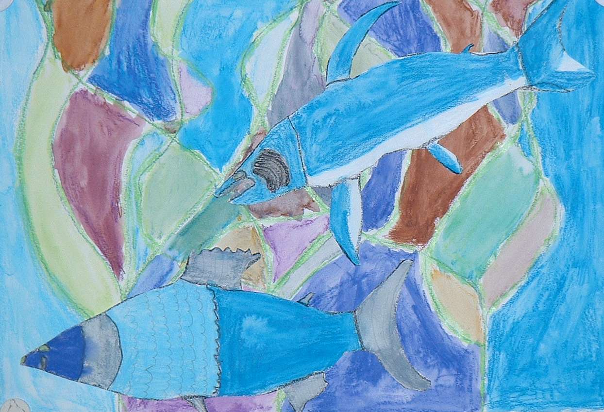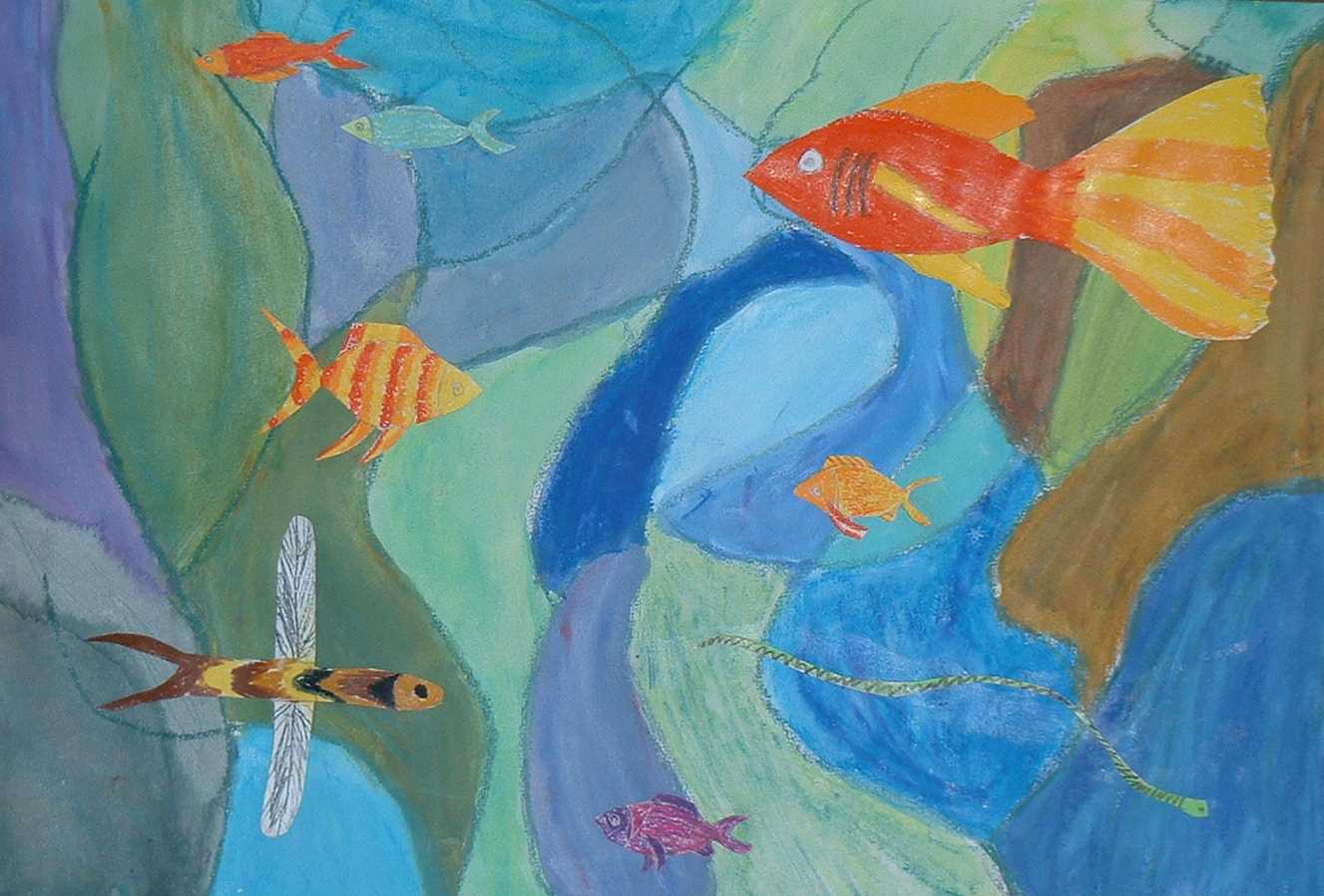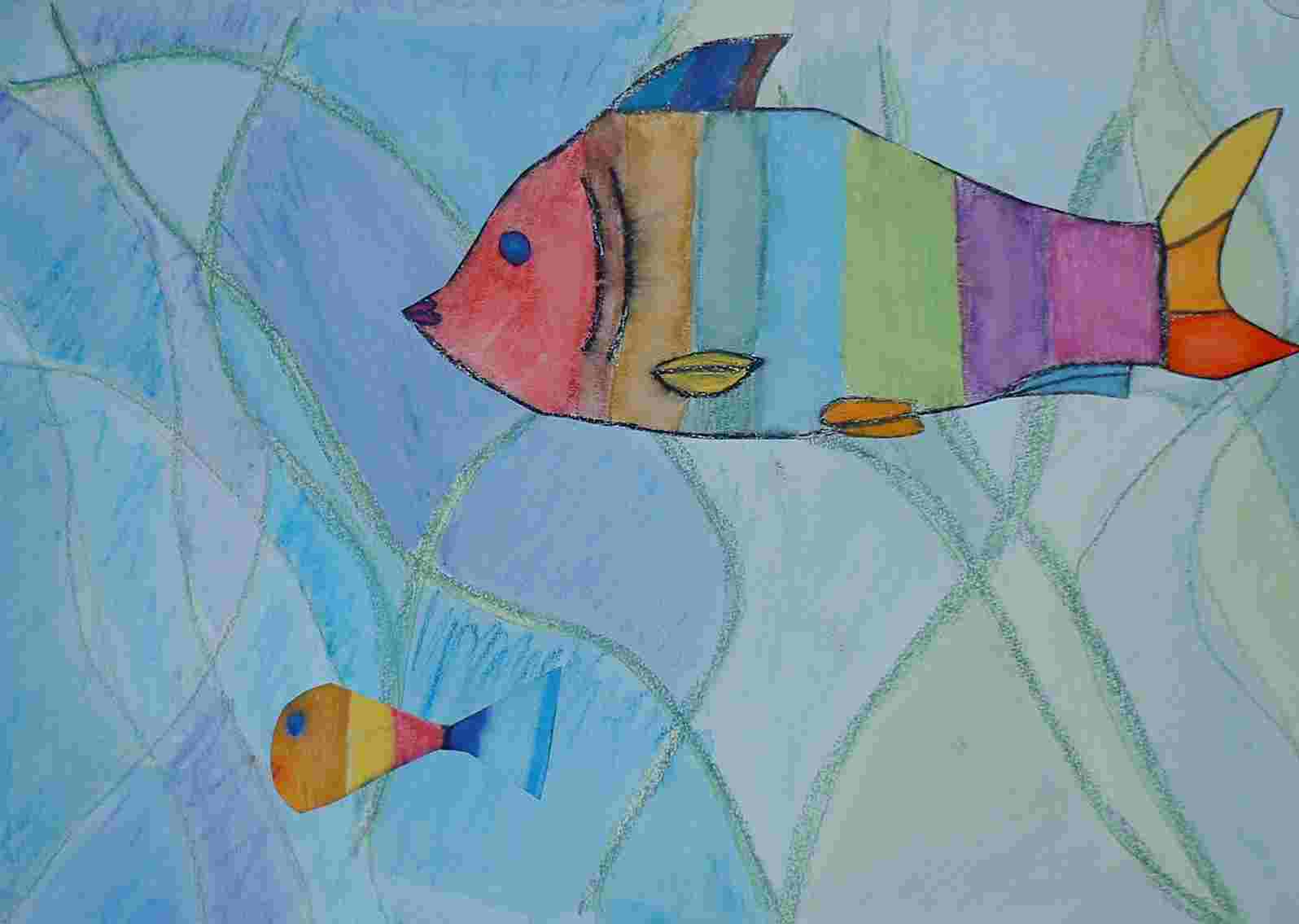 Nach einer eingehenden Diskussion über Fische und der Betrachtung vieler Bilder, die die Kinder zum Teil selber mitgenommen hatten, galt es selber Fische zu zeichnen und auf einen natürlich wirkenden Hintergrund zu kleben.
