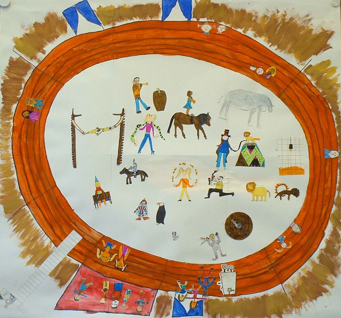 Jeder in der Klasse zeichnete eine Person, ein Tier oder einen Gegenstand des Zirkus. Dann wurden alle Teile in und um die Arena geklebt.
